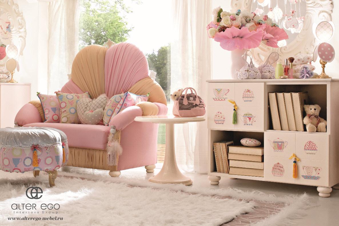 Комплект фантазийной мебели для детского интерьера KISS-ME KN06 TIRAMISU — диван-кровать и комод от итальянской фабрики AltaModa. Каркас дивана с высоким изголовьем изготовлен из натурального массива древесины, внутри — наполнитель, обеспечивающий удобство и безопасность для растущего организма. Снаружи — текстильная обивка с меховым декором. Комод с четырьмя дверцами и художественной росписью изготовлен из массива древесины.