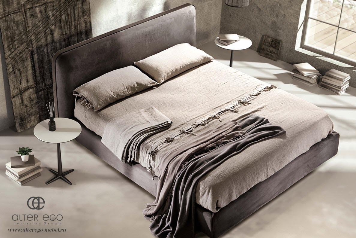 Большая двуспальная кровать ELVIS от бренда Cantori выполнена в современном стиле и темно-сером цвете. Отлично подходит для оформления спокойных и элегантных спальных обстановок. Изделие оснащено высоким простым изголовьем в мягкой обивке из той же ткани, что и корпус, и изящно-тонком деревянном обрамлении.