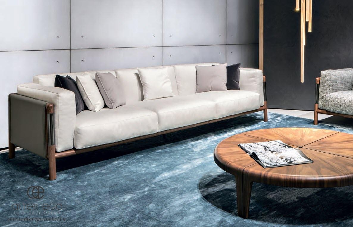 Современный итальянский диван URBAN в современном стиле. Прямая модель в статичном корпусе из дерева и обивке из натуральной кожи молочного оттенка с блеском. Для контрастной выразительности некоторые детали оригинального изделия обиты темно-серой кожей. Диван украшен декоративными подушками в текстильных чехлах серого и белого цвета.
