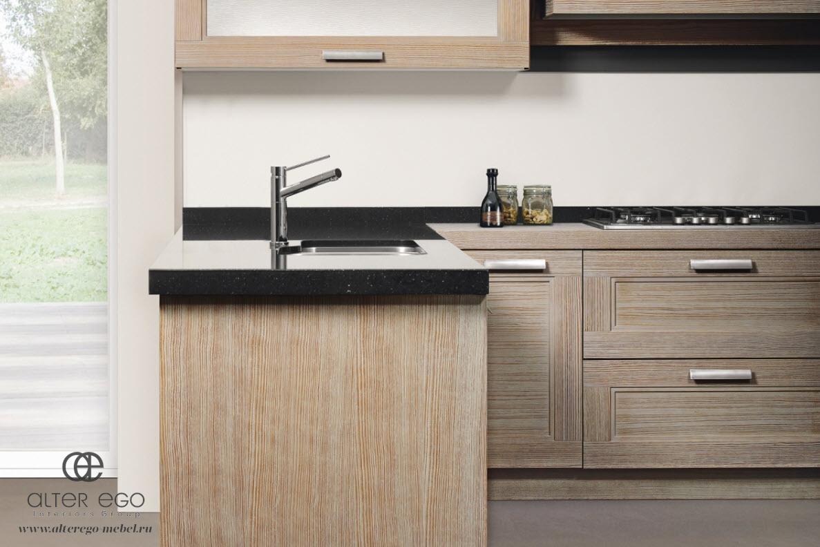Очень красивая угловая кухня LAGUNA с эффектной отделкой из светлого шпона с оригинальным рисунком натуральной древесины. Гарнитур оснащен приставным островом, рабочая поверхность которого отделана черным композитом «под мрамор» с яркими вкраплениями. Предметы, входящие в оригинальный комплект, по фасадам декорированы классической рамкой и интересной металлической фурнитурой.