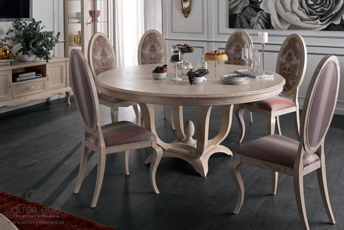 Эффектная столовая группа M2100 интересного дизайна в стиле арт-деко. Красивый комплект включает элегантную витрину в светлом деревянном корпусе с круговым остеклением; небольшой буфет на гнутых ножках с комбинированным фасадом; обеденный стол на оригинальном изножье под круглой большой столешницей и набор из мягких стульев и полукресел с круглыми спинками в узорчатой светло-розовой текстильной обивке.