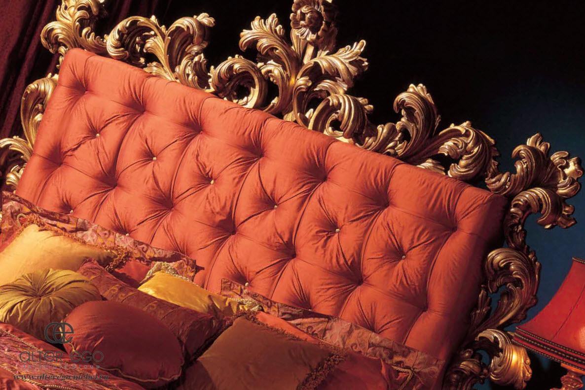 Роскошно-яркая оранжевая кровать CASANOVA в стиле барокко. Двуспальная модель с высоким, мягко-простеганным в технике капитоне изголовьем со скульптурно-резной позолоченной рамой. Изделие оснащено изящной банкеткой в ногах и ортопедическим ложем. Такая кровать – идеальное решение для меблировки спален классического направления различной площади.