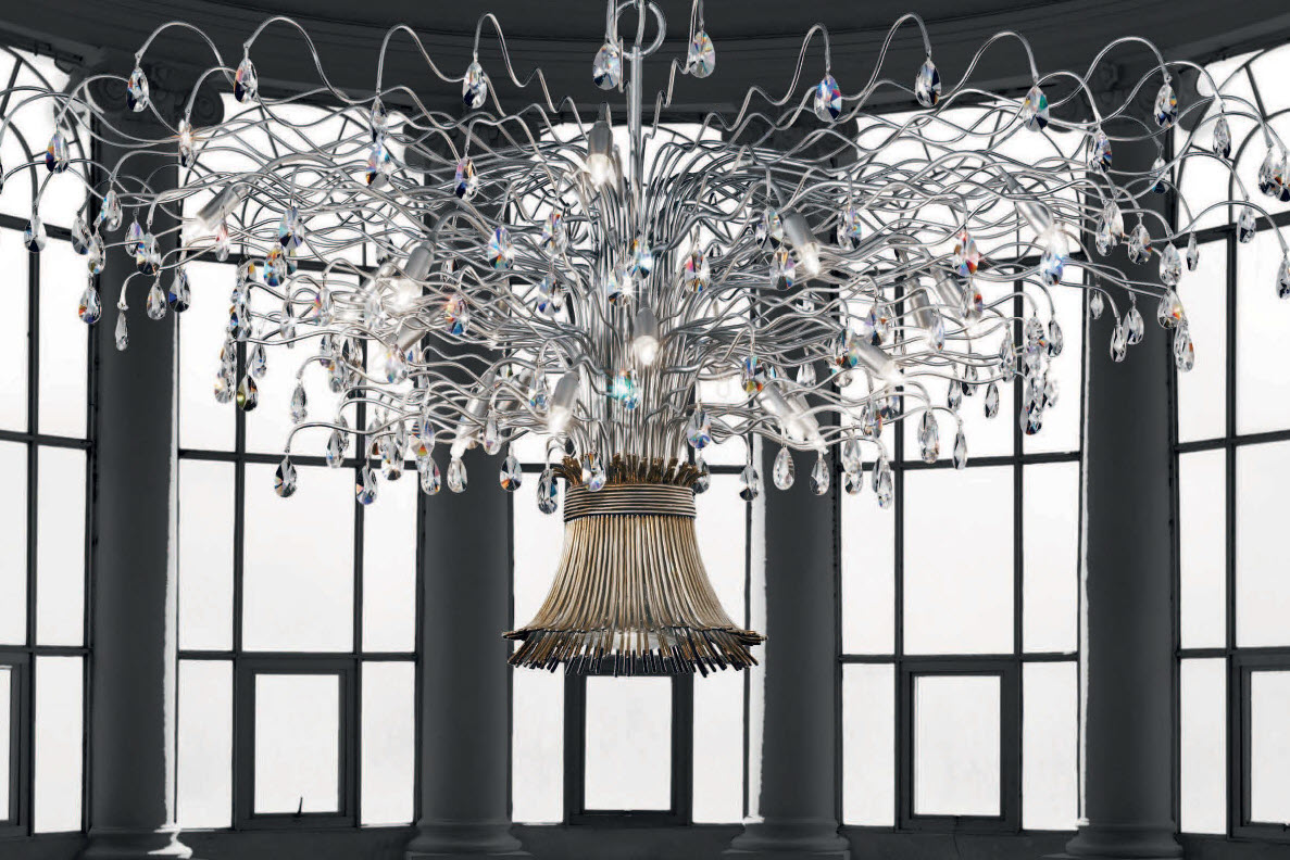 Классическая люстра CLOTH в широком металлическом корпусе с золочением. Многочисленные лампы модели, расположенные по кругу на разных уровнях, украшены полупрозрачными абажурами из фиолетового текстиля с эффектной драпировкой. Дополнительно изделие декорировано россыпью кристально-прозрачных бусин из муранского стекла, собранных на длинные низки.